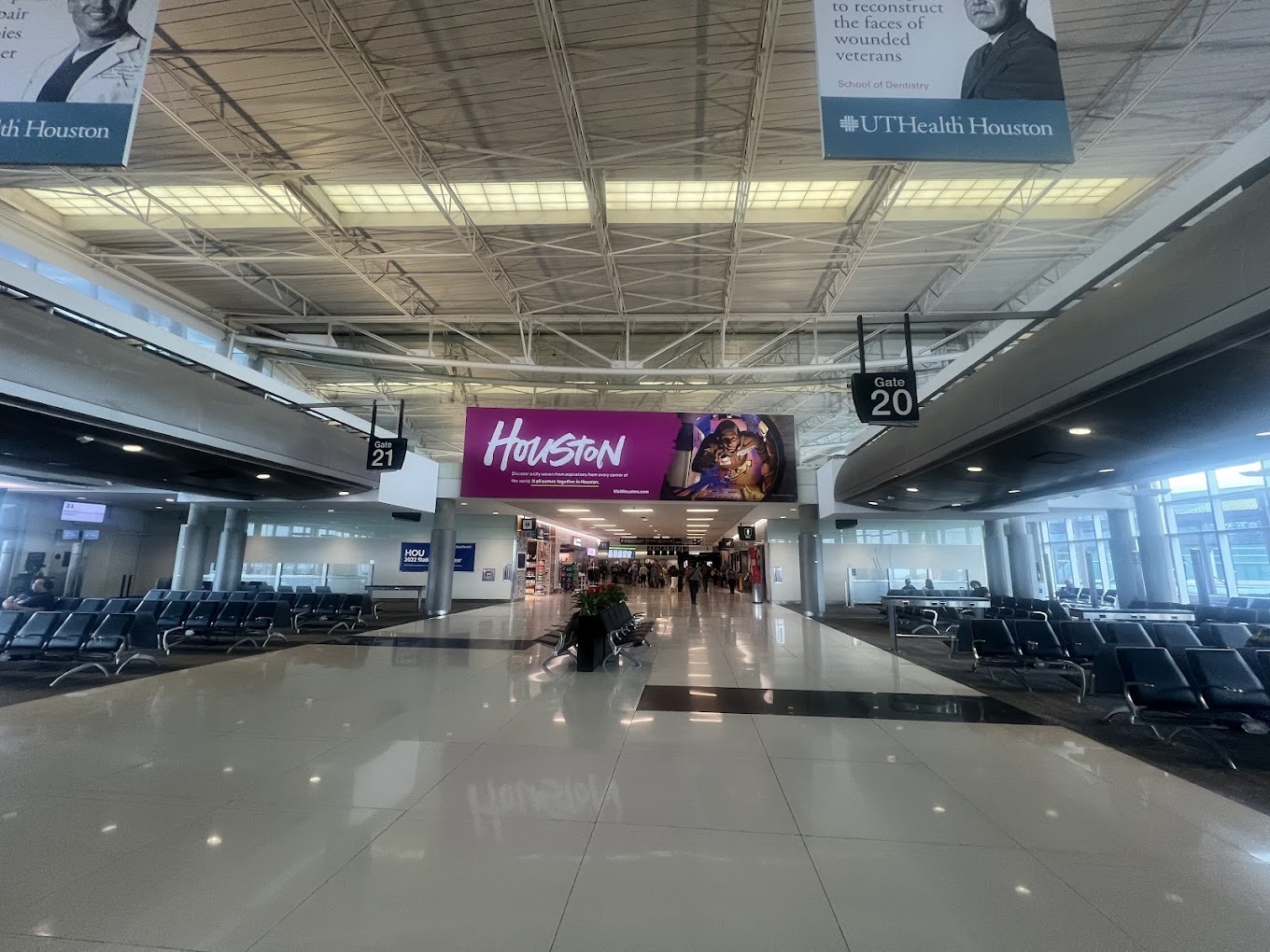 One of Hobby’s most frequently cited virtues is the compactness of its terminal. There is one main terminal building, wrapped around a central ticketing and security hub, with concourses radiating outward. You can walk between gates in minutes — not the mileage-accumulating hike that defines airports with multiple disconnected terminals.